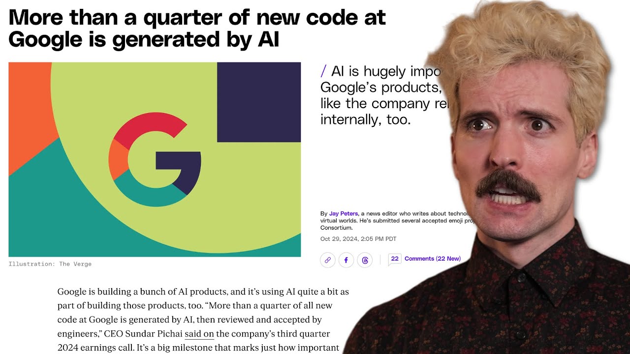 Vergeの記事を見てみましょう。Googleは多くのAI製品を開発してて、それらの製品開発にもAIをかなり使ってます。CEOのスンダルの言葉を直接引用すると、「Googleの新しいコードの4分の1以上がAIによって生成され、それからエンジニアによってレビューされ、承認されている」と決算説明会で言うてはります。これはかなりヤバイことです。